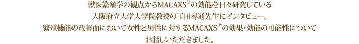 獣医繁殖学の観点からMACAXS®の効能を日々研究している大阪府立大学大学院教授の玉田尋通先生にインタビュー。繁殖機能の改善面において女性と男性に対するMACAXS®の効果・効能の可能性についてお話しいただきました。